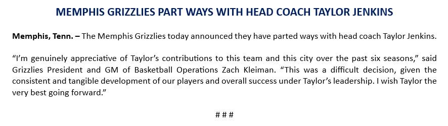 由衷感谢泰勒-詹金斯在过去六个赛季为球队和这座城市所作出的贡献,这是一个非常困难的决定,在他的带领下,球员们逐渐进步,并取得了一定的成功。衷心祝愿泰勒未来一切顺利。